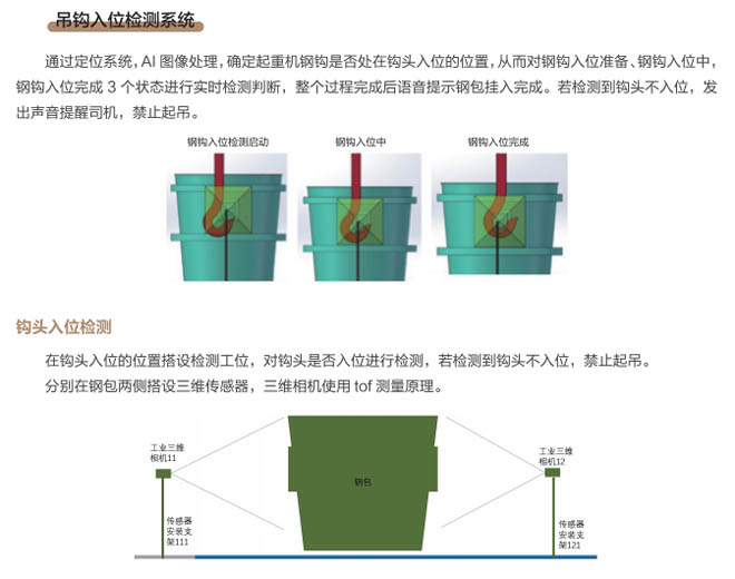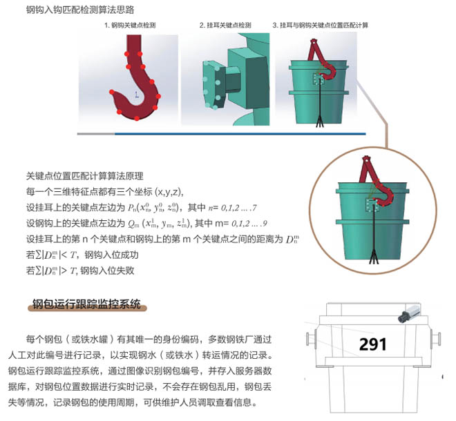 近年來,冶金行業(yè)智能化、自動化、云時代等大數(shù)據(jù)廣泛應用,煉鋼車間是冶金行業(yè)的重點區(qū)域,廠區(qū)設備復雜、環(huán)境差、安全隱患多等因素更需要進行設備自動化、智能化的升級管理、實現(xiàn)廠區(qū)無人化智慧工廠目標的發(fā)展。起重機作為煉鋼、煉鐵、軋鋼車間的主要設備,起重機工作中對在工位操作越來越精準,需要駕駛員及時準確觀察工位狀態(tài),由于駕駛室的位置和現(xiàn)場的工況環(huán)境影響經(jīng)常引起操作失誤,鋼包起吊安全事故頻發(fā),特別是對于鋼包掛鉤是否完整嵌入掛耳,是否進入正確的起吊姿態(tài)沒有直接的判斷和監(jiān)控。研發(fā)起重機鋼包定位掛鉤識別管理系統(tǒng)是安全生產(chǎn)的剛性需求。